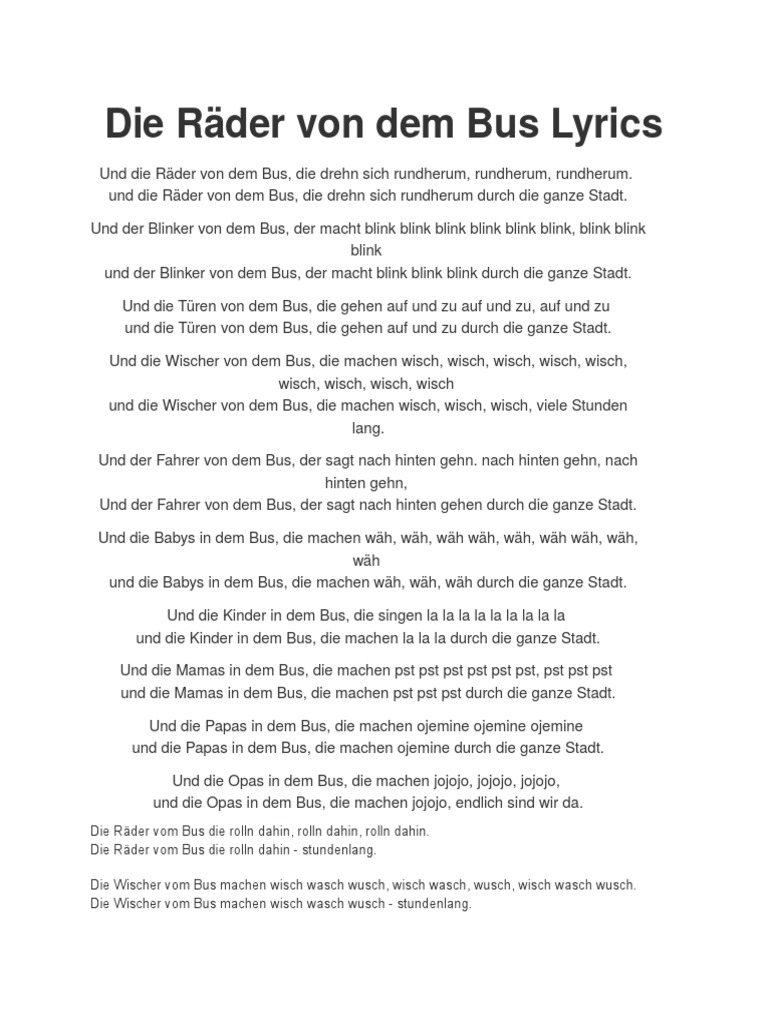 Zeig mir, wenn du bei mir bist,. Die räder vom bus dreh'n sich im kreis die wischer vom bus machen wisch, wisch, wisch. Begleitet uns bei dieser tollen busfahrt! Train, bus & flight fares from over 800+ providers for you to choose from Der busfahrer der sagt guten tag guten tag guten tag der busfahrer der sagt guten tag wenn er wieder losfährt. Maybe you would like to learn more about one of these? Savesave die räder vom bus for later. The wipers on the bus go swish, swish, swish, all day long. (mit zeigefinger zum mund als pst) die väter im bus machen oh je oh je, oh je oh je, oh je oh je. Die räder vom bus mix mit tieren (sing mit v.) kinderlieder in deutscher sprache yleekids. 0 ratings0% found this document useful. Die mütter im bus machen pst pst pst, pst pst pst, pst pst pst. Die wischer vom bus machen wisch, wisch, wisch.